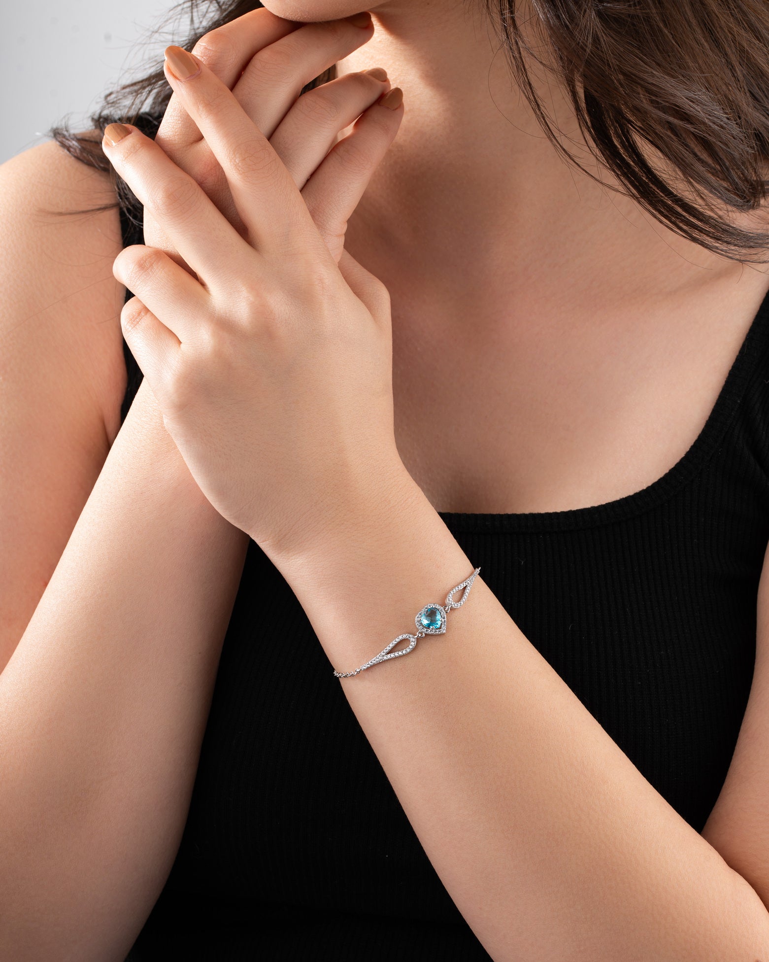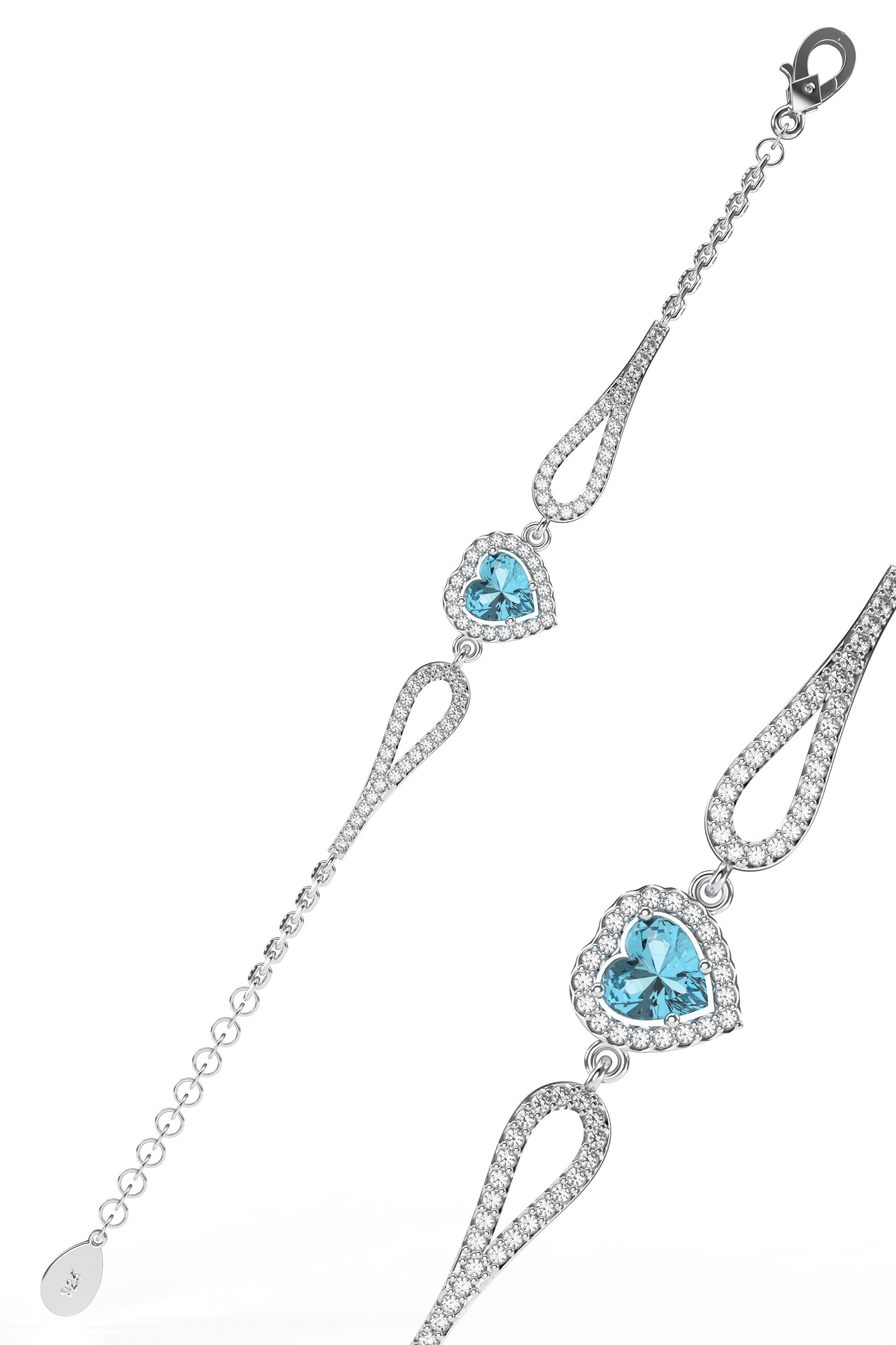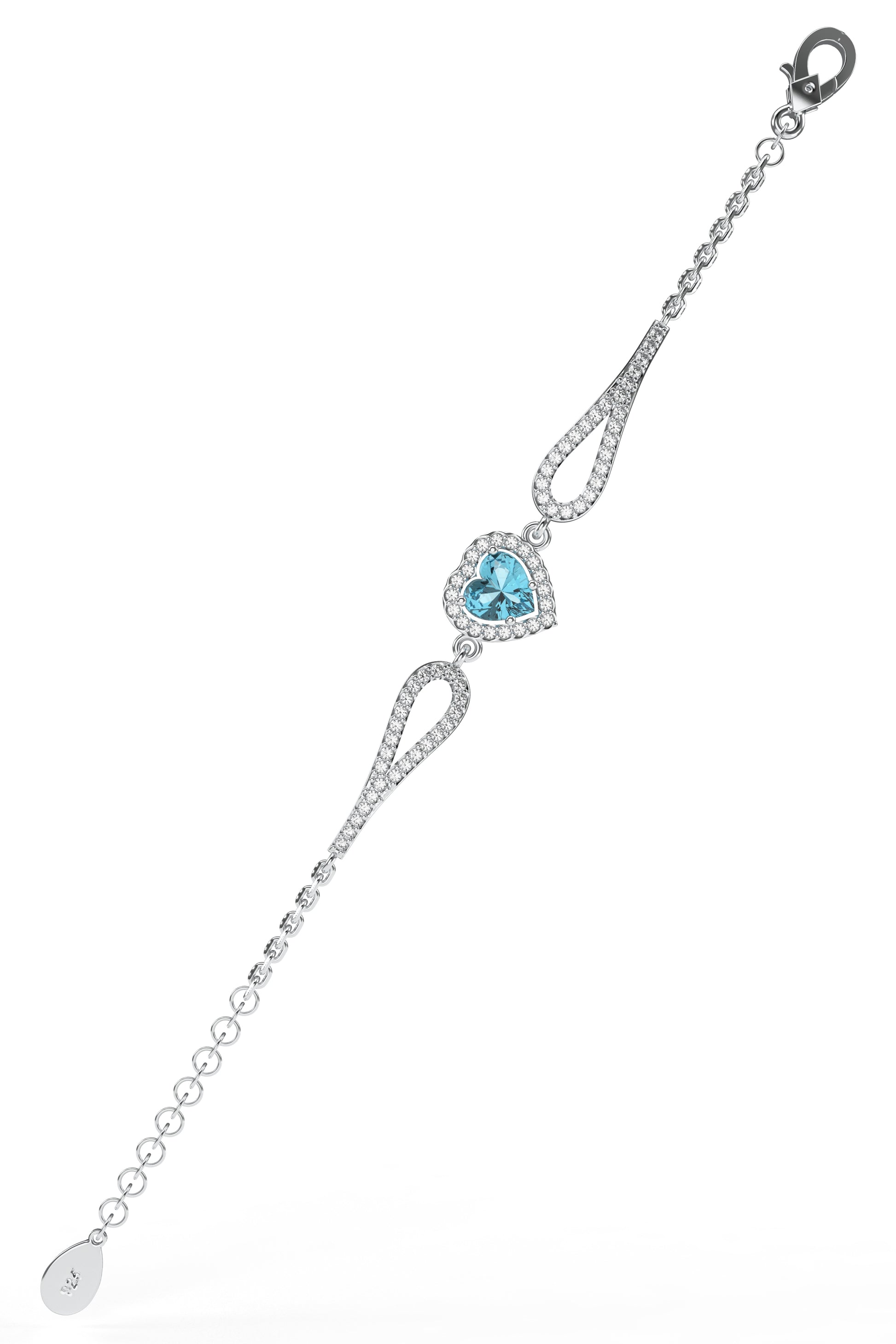 925 Ayar Akuamarin Taşlı Rodyum Pırlanta Görünümlü Kalp Gümüş Bileklik
