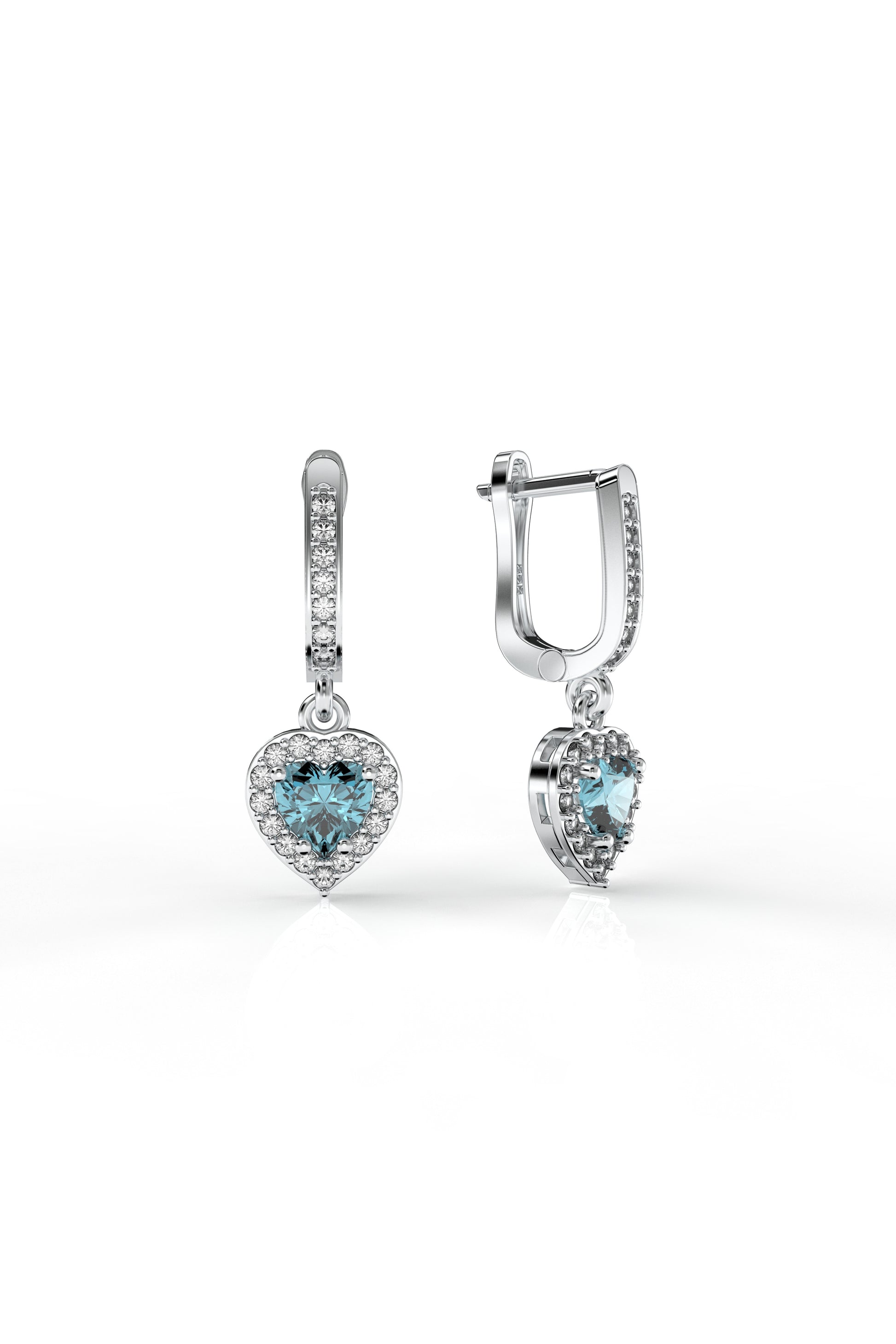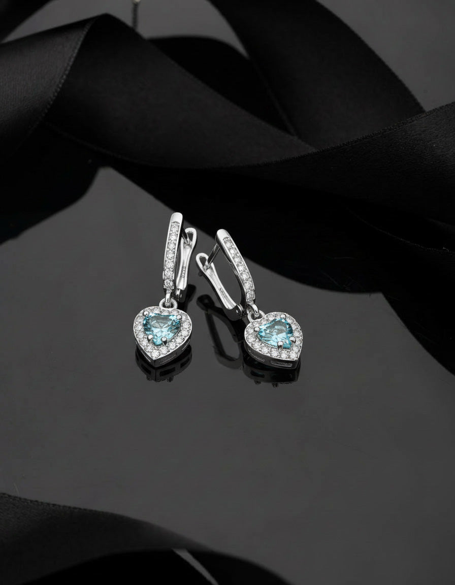 925 Ayar Akuamarin Taşlı Rodyum Pırlanta Işıltılı Sallantılı Kalp Gümüş Küpe