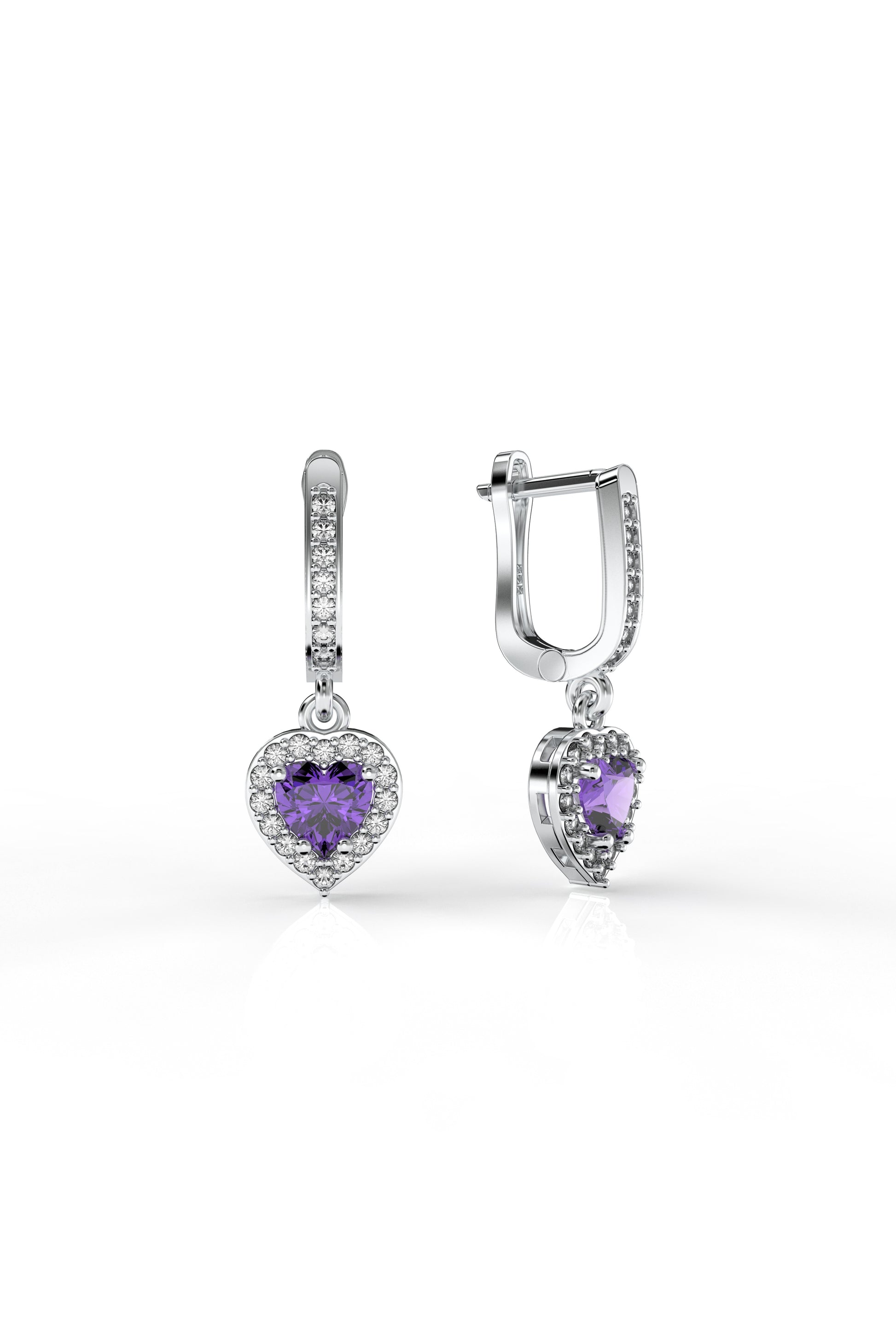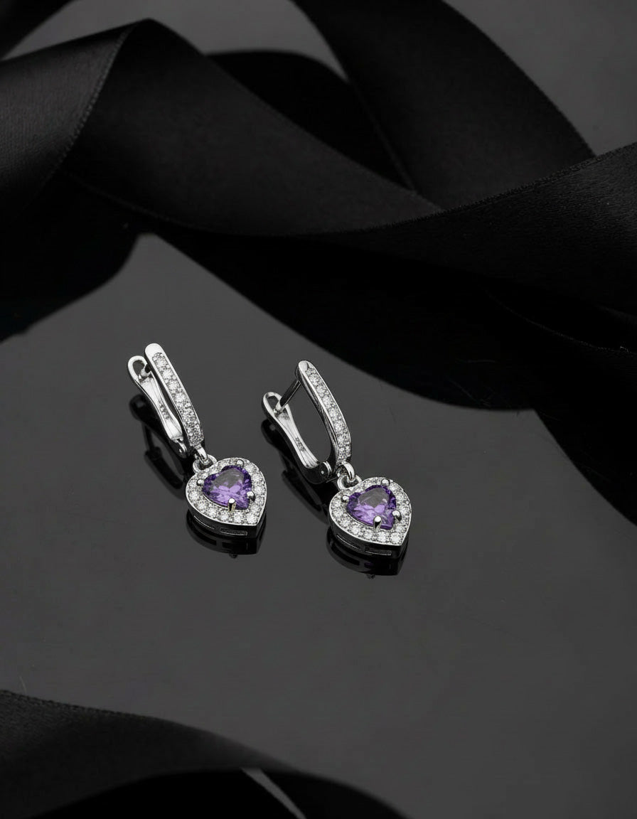 925 Ayar Ametist Taşlı Rodyum Pırlanta Işıltılı Sallantılı Kalp Gümüş Küpe