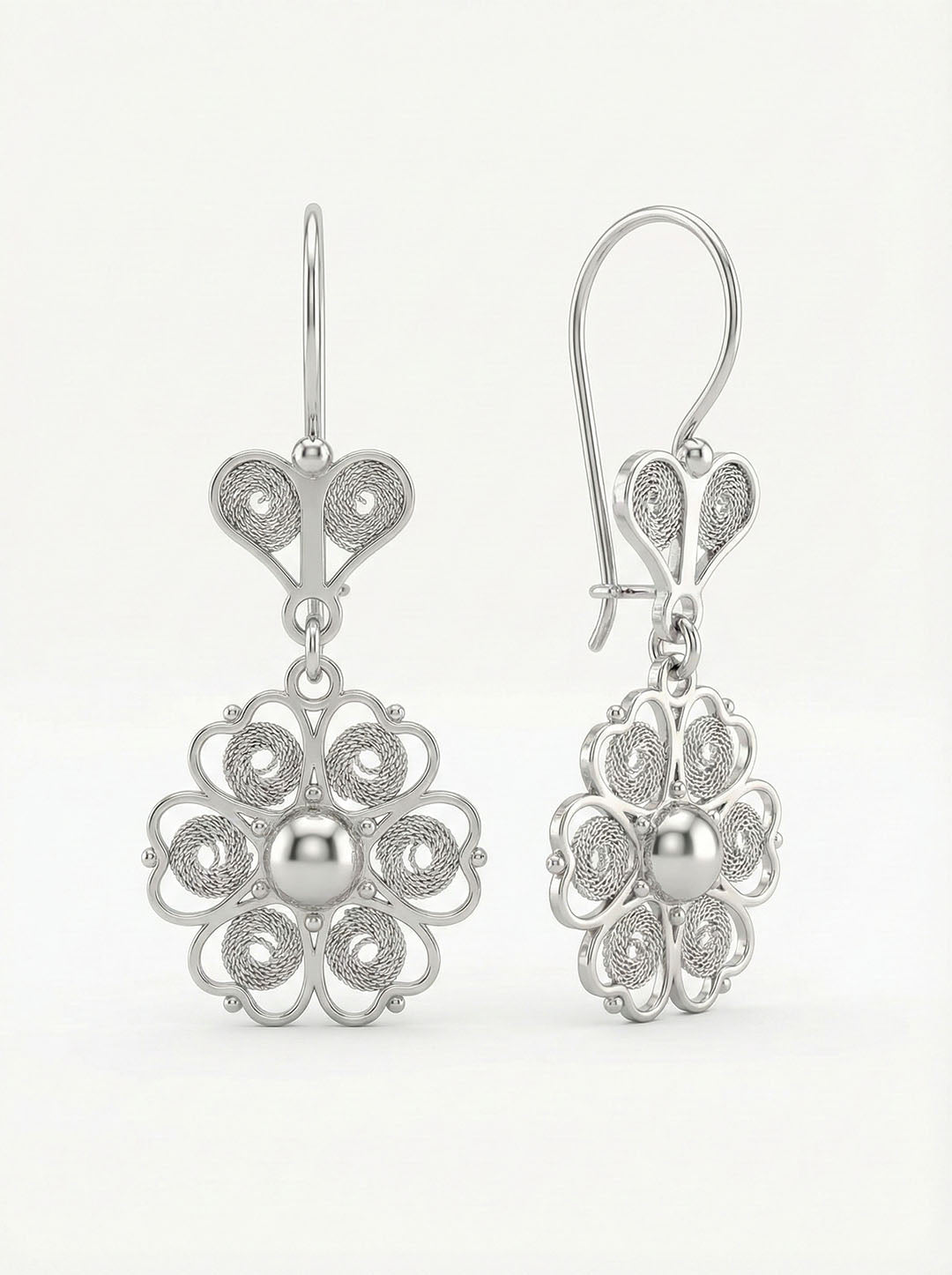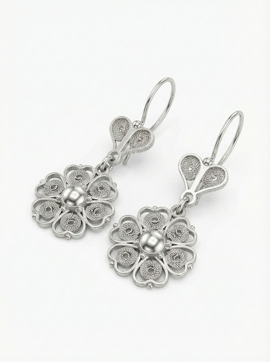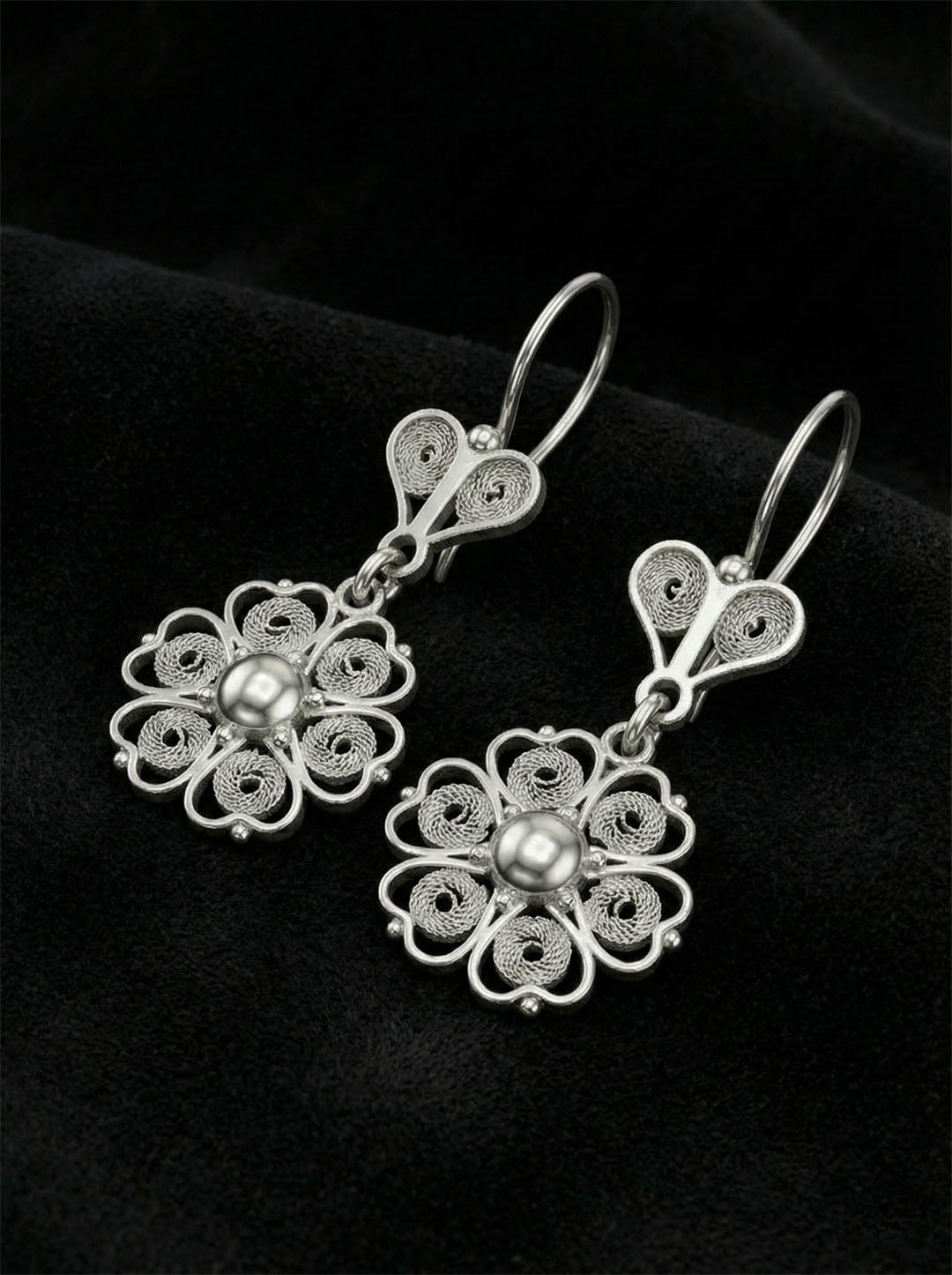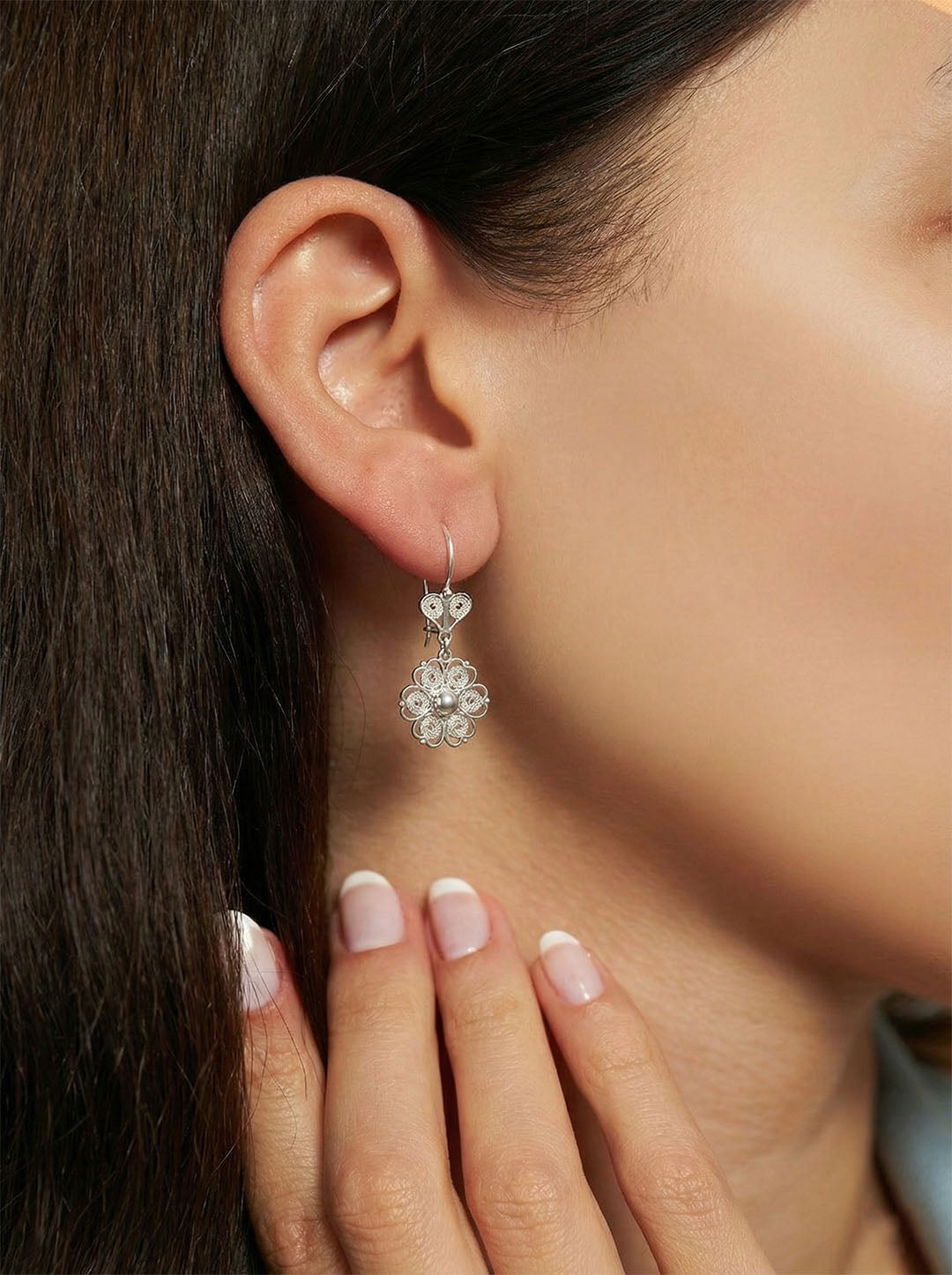 925 Ayar Geleneksel Telkari Elişi Sanatı Gümüş Çiçek Motifli Sallantılı Küpe