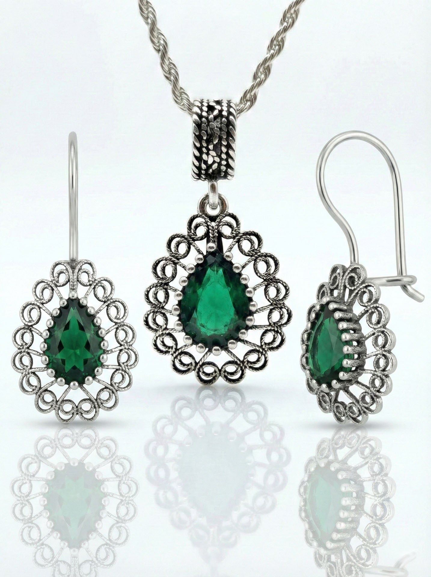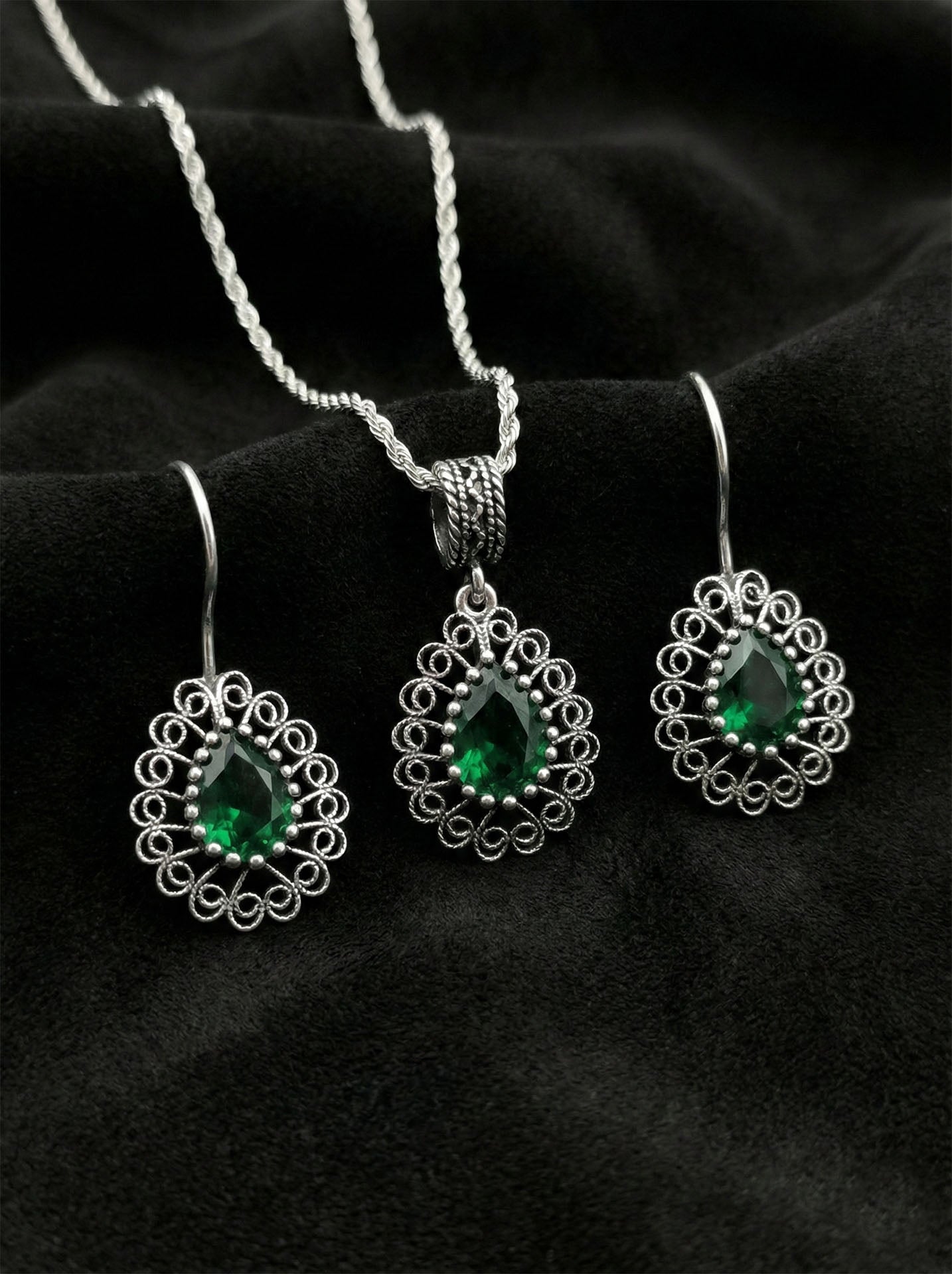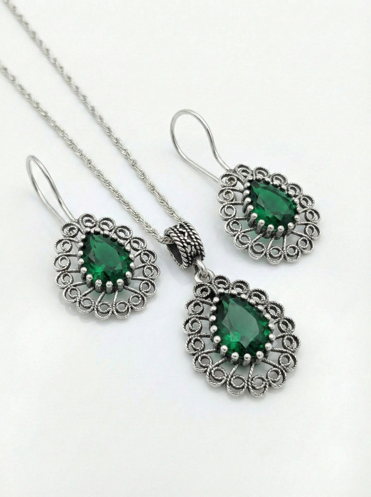 925 Ayar Gümüş Zümrüt Taşlı Elişi Geleneksel Damla Telkari Kolye-Küpe 2'li Set