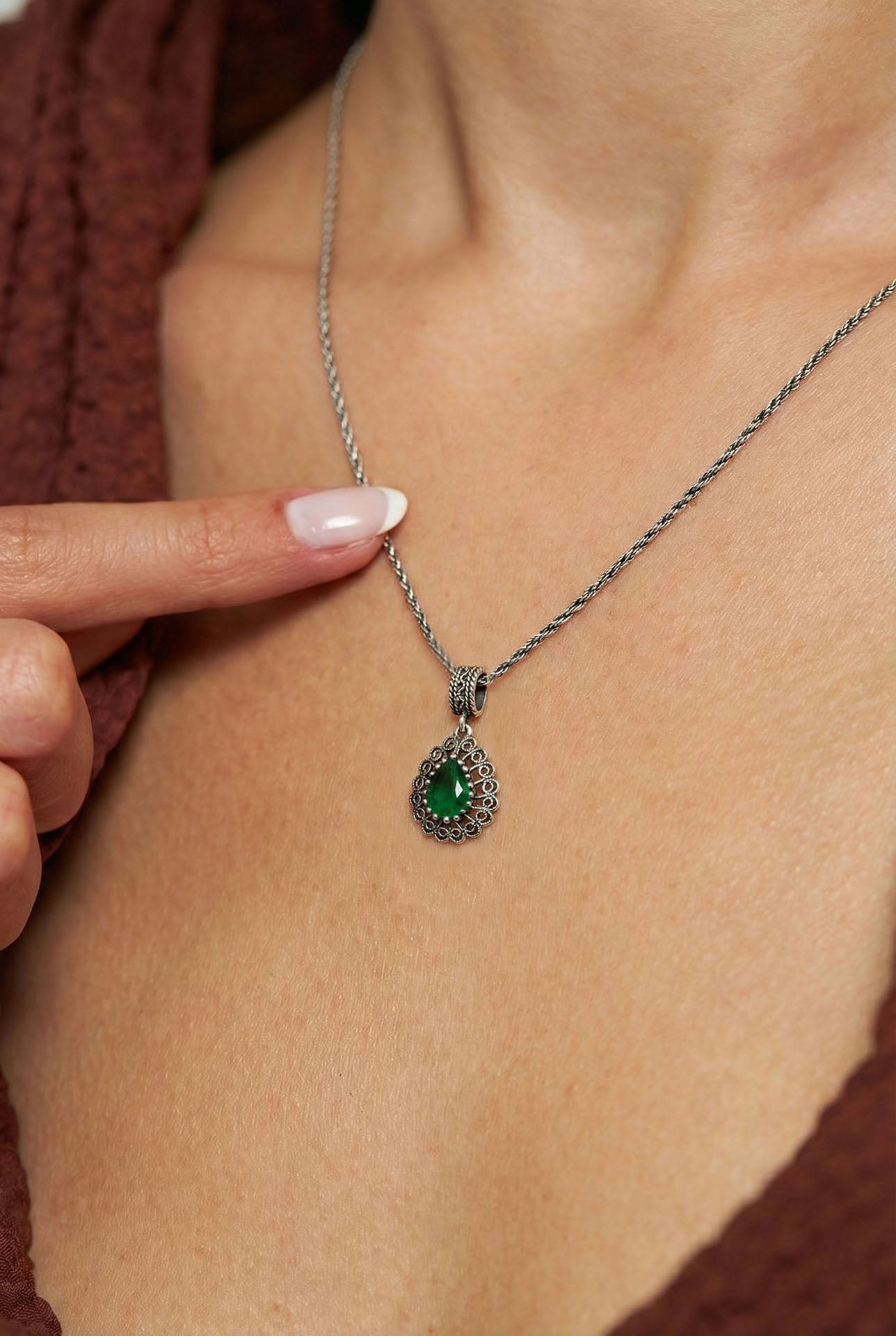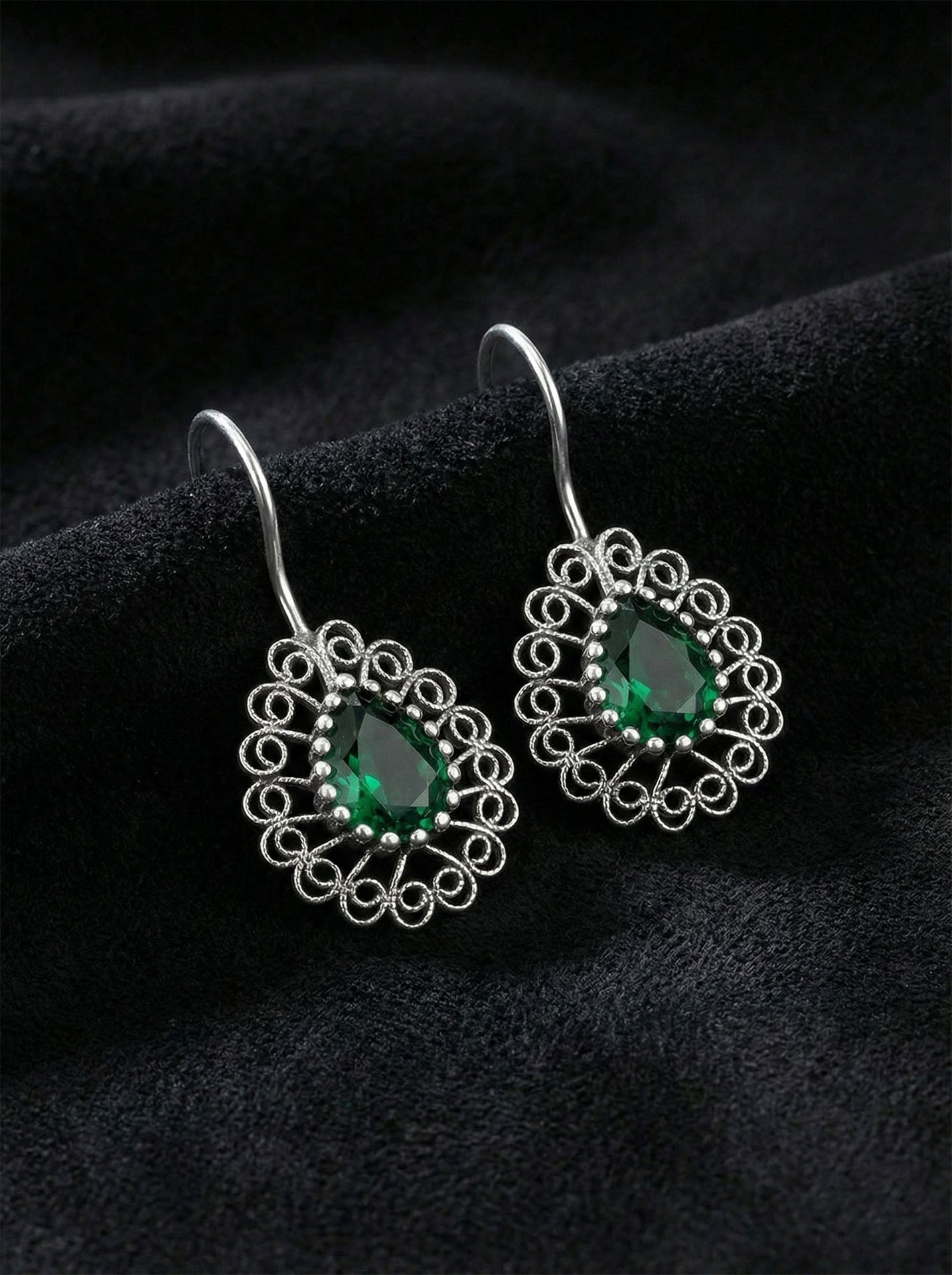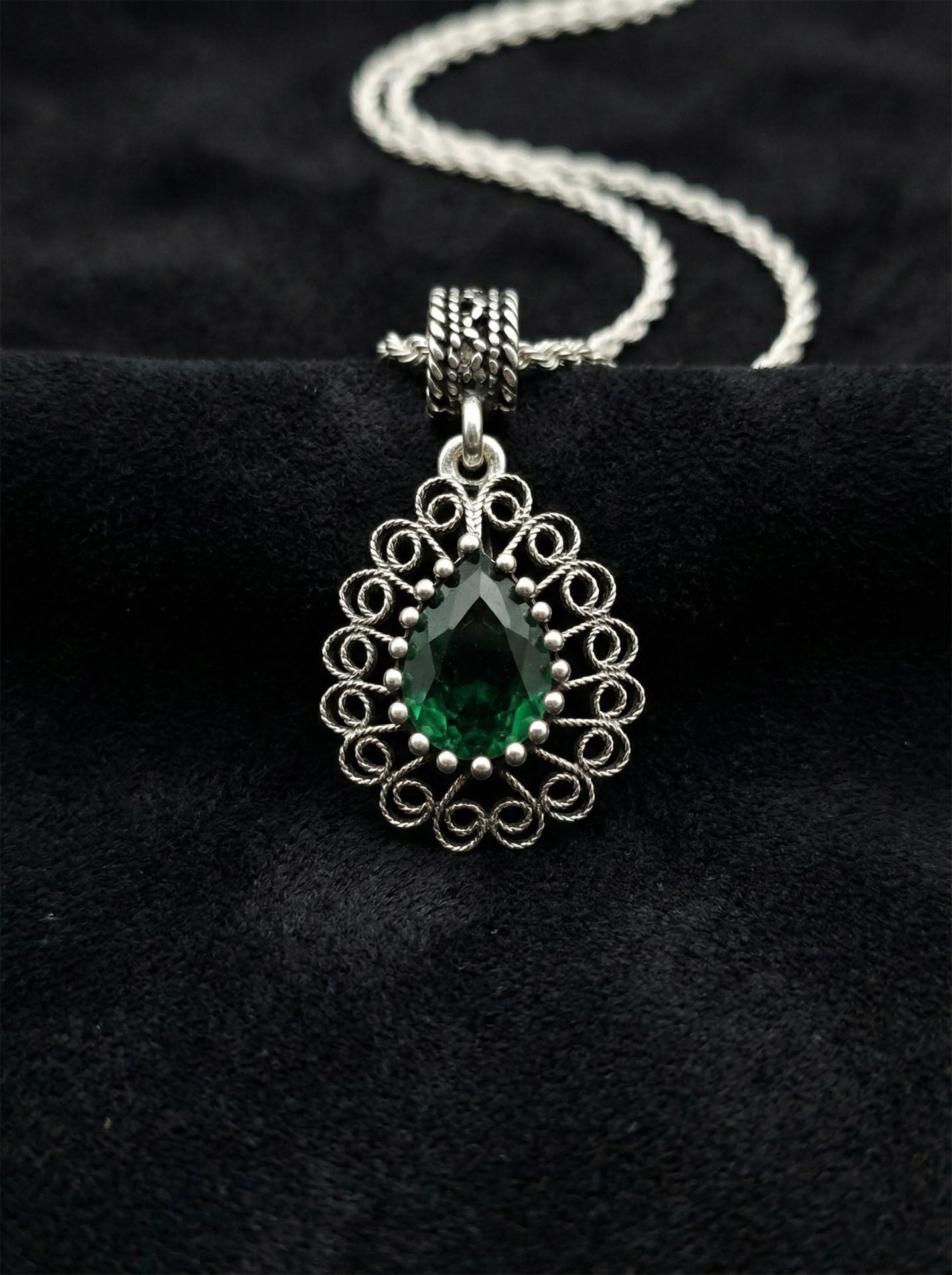 925 Ayar Gümüş Zümrüt Taşlı Elişi Geleneksel Damla Telkari Kolye-Küpe 2'li Set