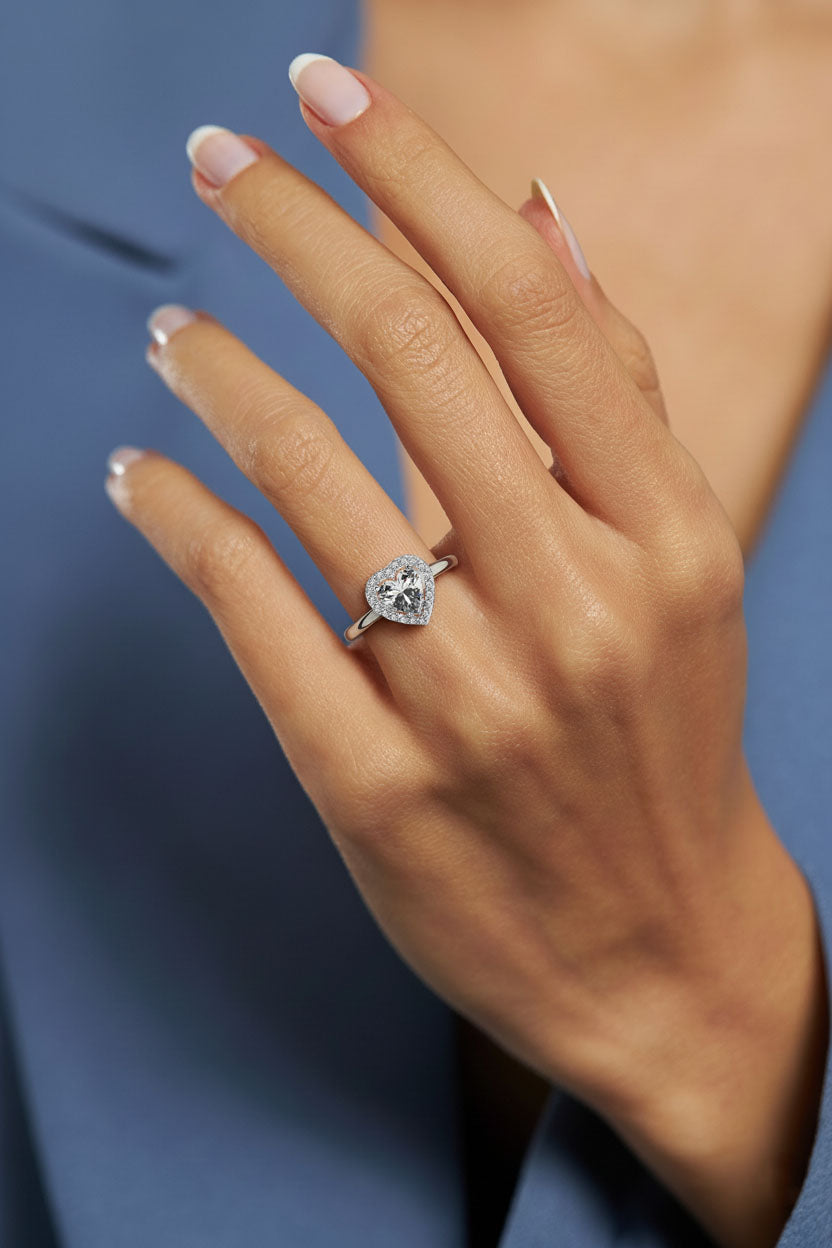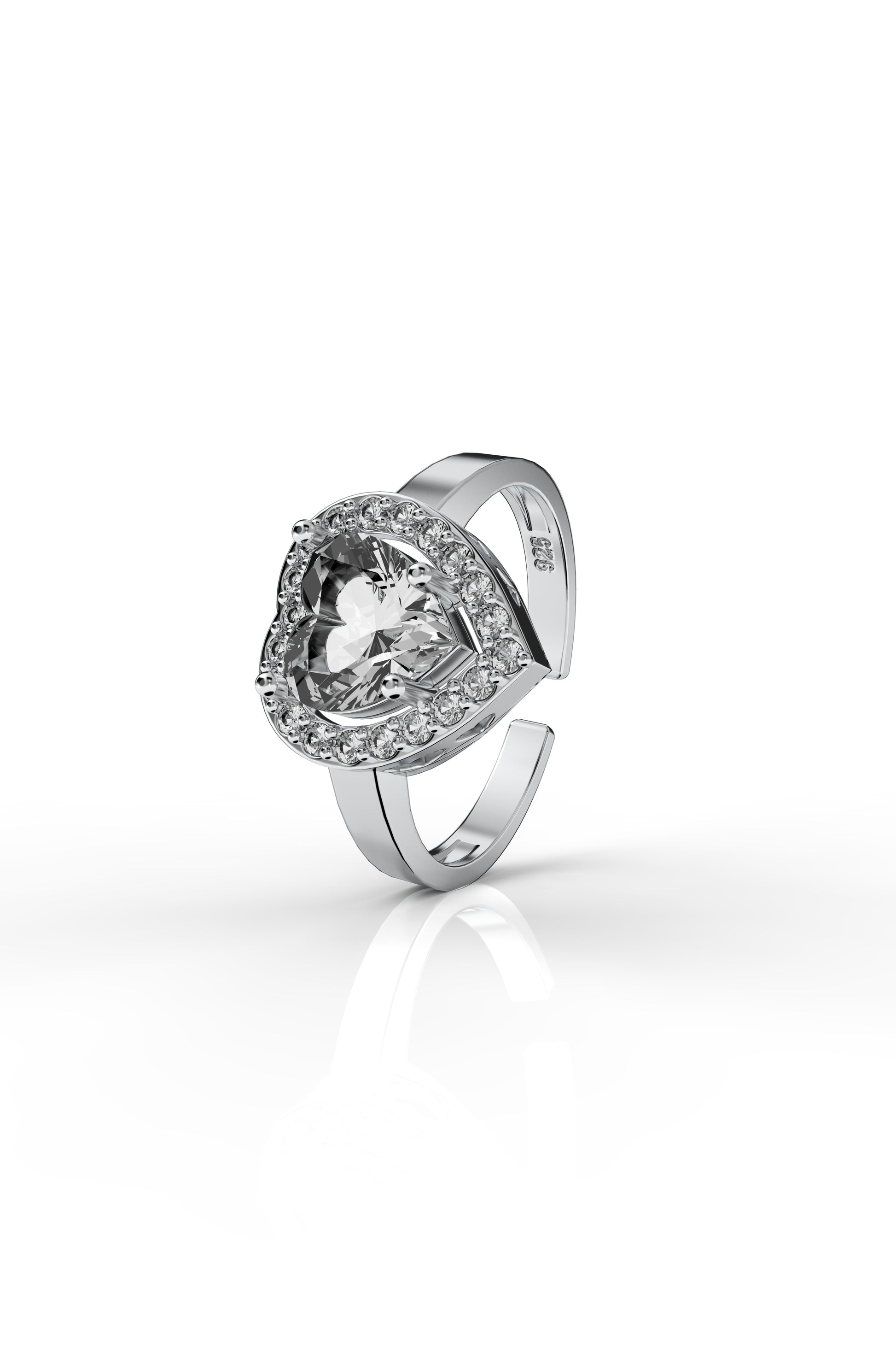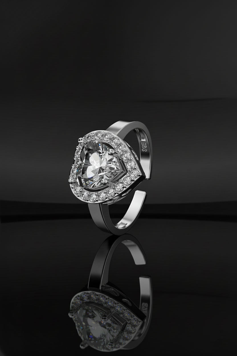 925 Ayar Zirkon Taşlı Rodyum Pırlanta Işıltılı Kalp Ayarlanabilir Gümüş Yüzük